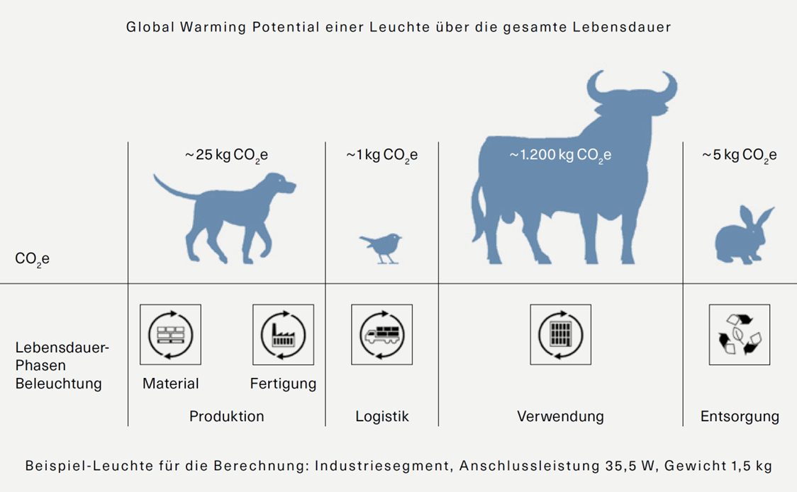 Die Grafik aus dem Nachhaltigkeitsbericht der Zumtobel Group veranschaulicht das eindrücklich. Die Nutzungsphase dominiert die Bilanz mit Abstand, während Logistik und Entsorgung kaum ins Gewicht fallen und in der Produktion grosses Potenzial besteht.